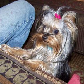 I am trying to take a photo of her in the same position as a photo I saw on your website of her Dad, Max. Max was looking out a window and it was a beautiful photo. I have floor to ceiling windows in my living room and I am trying to pose Tink just like Max was in that photo. Not having much success with that task. She looks like a little rag-a-muffin. I comb her and she is beautiful for 10 seconds. Then the hair goes back to separating into strands - but she is soooooo beautiful. I think I will keep her hair long. Once the puppy fur fell out she has actual hair - like people. It doesn't really tangle. I groom my pups myself. Anyway, thanx again for Tink. She makes me smile! T Love hearing from my Yorkie puppies and their people. That silky coat really is easy to keep. Tink could have her own fan club- she has people writing to me often, to try to buy her.... |
