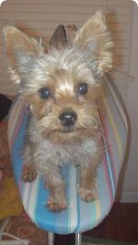 Here is Pancake, our California puppy, above as a baby, and surfing on the ironing board . |