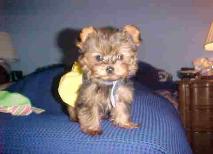 | Just wanted to let you know that his first night went really well. He cried a little, as to be expected, but it was no big deal. He loves the canned puppy food, and is staying well hydrated, so I think he will do just fine. I went to the petstore today and found itty bitty puppy bones (about the size of a macaroni noodle). I gave him one and he actually crunched it into small pieces and ate it. It was the cutest! I can't get over how friendly and playful he is! He is a great puppy. Thanks again for everything. I will send you some pictures and another update when he gets a little bigger. This is a tiny Yorkie puppy from Smartie and Jazmine. |
